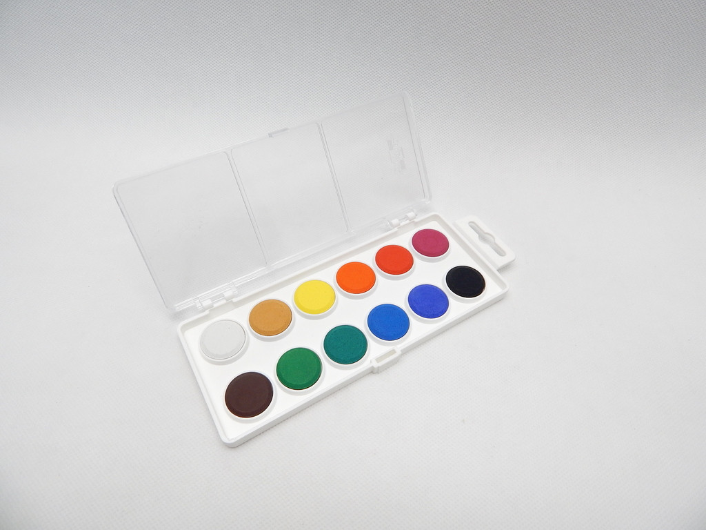 Klasické vodové barvy v soupravách po 12 odstínech. Mají jasné a syté barvy. Velikost tablet je 22,5 mm v průměru. Barevník je obdélníkového tvaru z plastu.