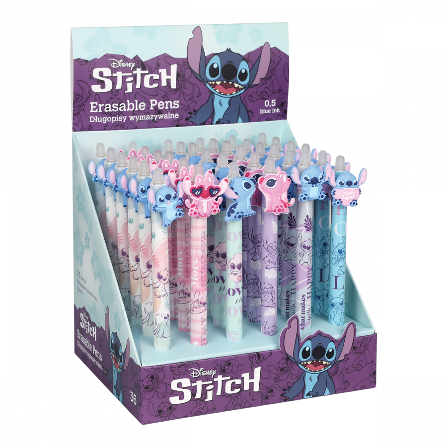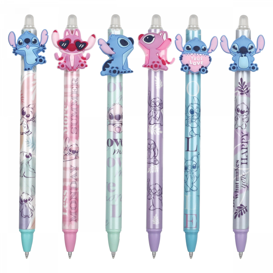 Praktická gumovatelná pera v pastelových barvách s veselými motivy mimozemského Stitche. Kvalitní inkoust lze v případě potřeby jednoduše vygumovat a přepsat.