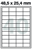 Kancelářské samolepicí etikety - univerzální pro inkoustové, laserové tiskárny a kopírovací zařízení. Etikety jsou vyrobeny násekem archu A4. Rozměr etikety: 48,5 × 25,4 mm. Etiket v balení: 4000 ks. Balení obsahuje 100 archů.