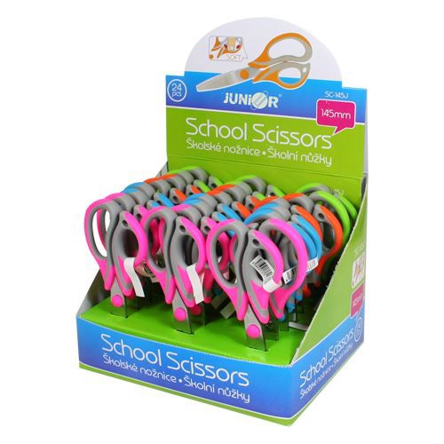Školní nůžky s kulatou špičkou 14,5 cm. Měkký ergonomický úchop pro snadnější držení. Mix 4 barev.