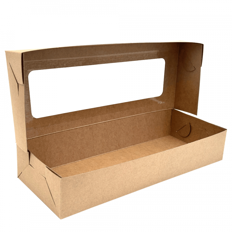 Odnosová krabice s okénkem je vyrobena z FSC® certifikovaného materiálu pro bezpečnost potravin. Vyrobena z materiálu KRAFT hnědo-hnědá lepenka. Dodávána v rozloženém stavu. Materiál je vhodný pro styk s vlhkou a mastnou potravinou.
