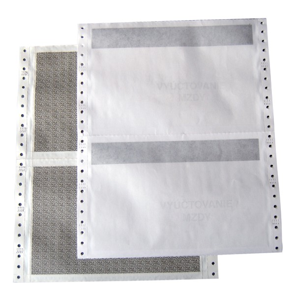 Mzdové obálky jsou vyrobeny jako tabelační papír 25x12"/6" 1+2. Po vytištění mzdových údajů se vrchní originál oddělí a zůstává v účtárně. Na první kopii se přes propisovací pruh propíše jen část údajů (např. jméno zaměstnance, výplatní období). Diskrétní údaje zůstávají uzavřené a utajené až na druhé kopii. V balení je 1000 ks obálek.