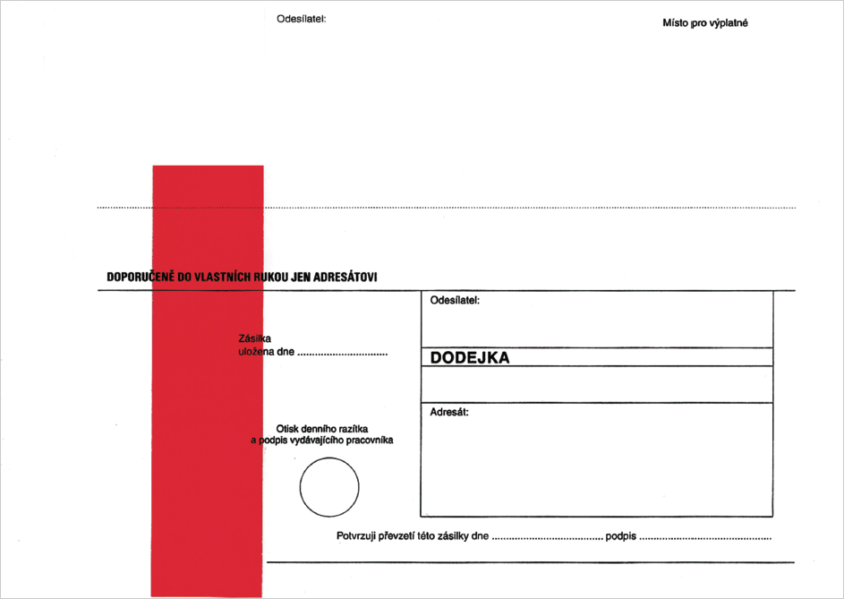 Obálky formátu C5 162x229mm s Dodejkou ve formě vytrhávacího okénka (okénko se v perforaci vytrhne z těla obálky), podlepeného samopropisujícím papírem, s červeným pruhem. 1 bal.=1000 ks