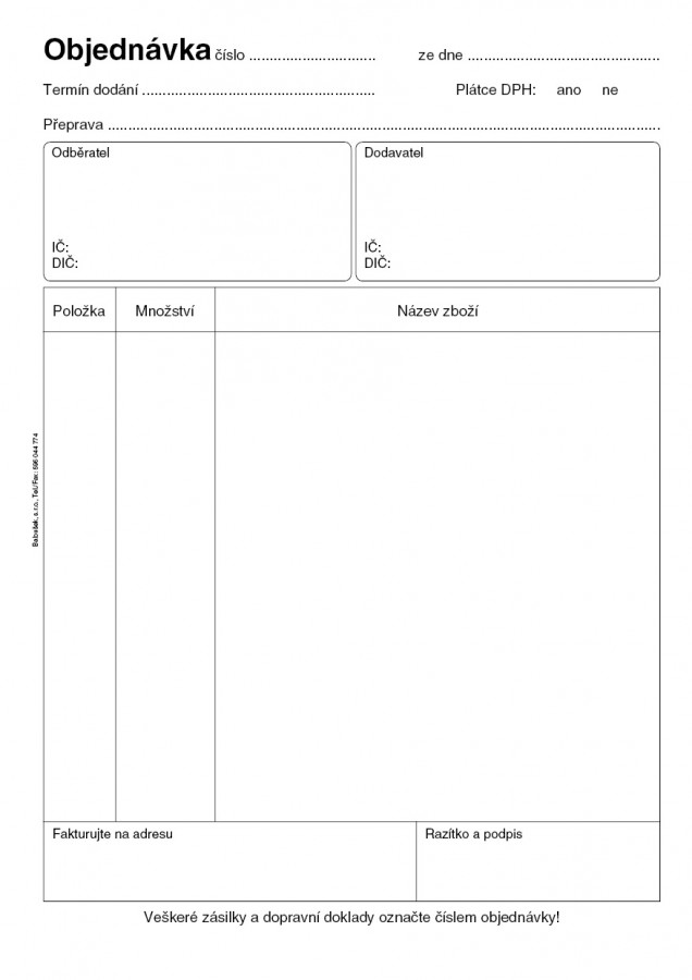 Objednávka 50 listů, formát A5, přímopropisující tiskopis.