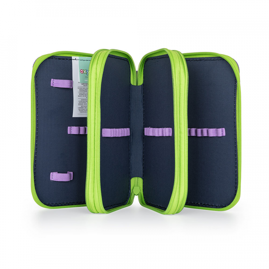 Školní penál třípatrový bez náplně. Penál obsahuje 40 gumových poutek pro uložení všech psacích potřeba a drobností potřebných k výuce. Penál má pevný zip s velkými taháčky pro snadnou manipulaci. Jedno patro je opatřeno průhlednou přihrádkou pro týdenní rozvrh. Rozměry 20x13x7 cm.