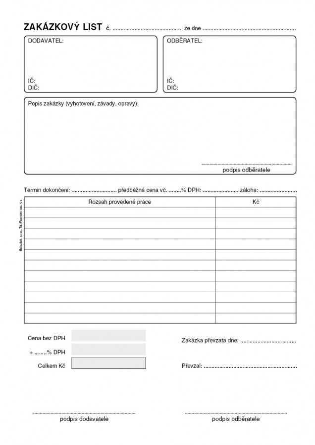 Zakázkový list 50 listů, formát A5, přímopropisující tiskopis.