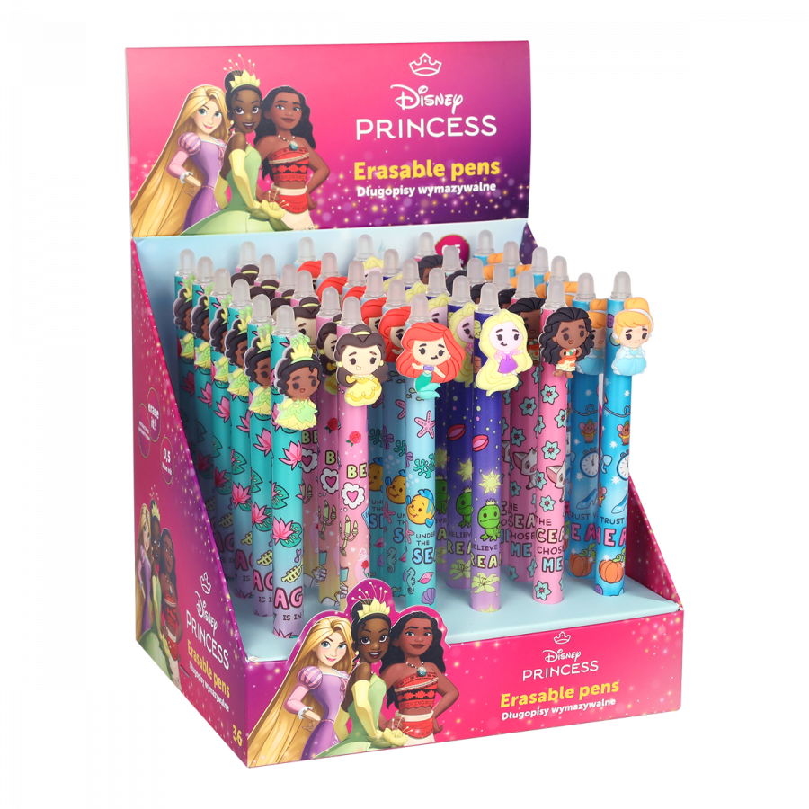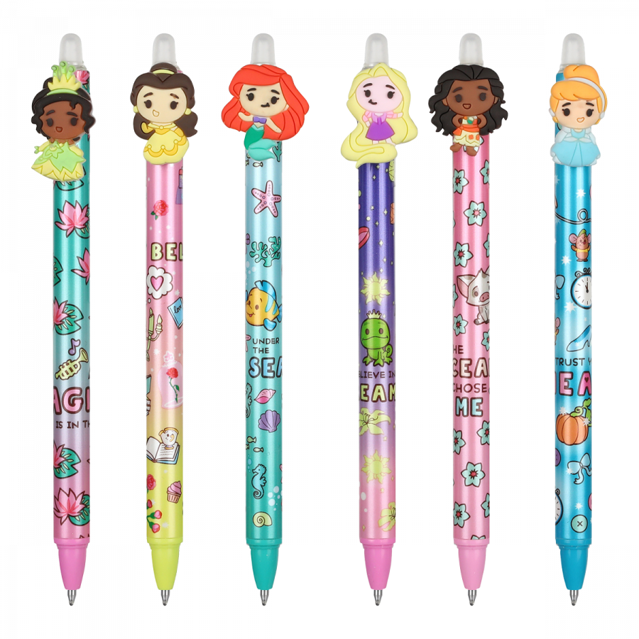 Praktická gumovatelná pera pro děti s měkkou koncovkou a motivy nejznámějších princezen z dílny Walt Disney. Kvalitní inkoust lze v případě potřeby jednoduše vygumovat a přepsat.