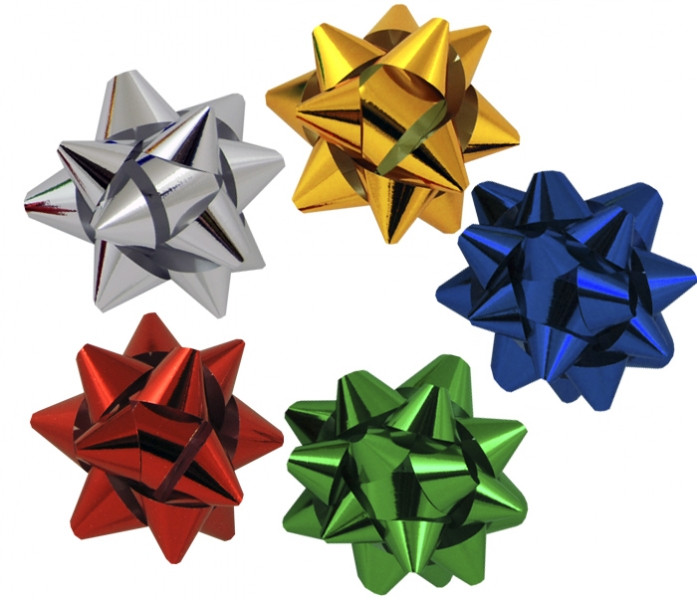 Rozeta/hvězdička se samolepicí plochou k nalepení na dárky. Průměr 8 cm.