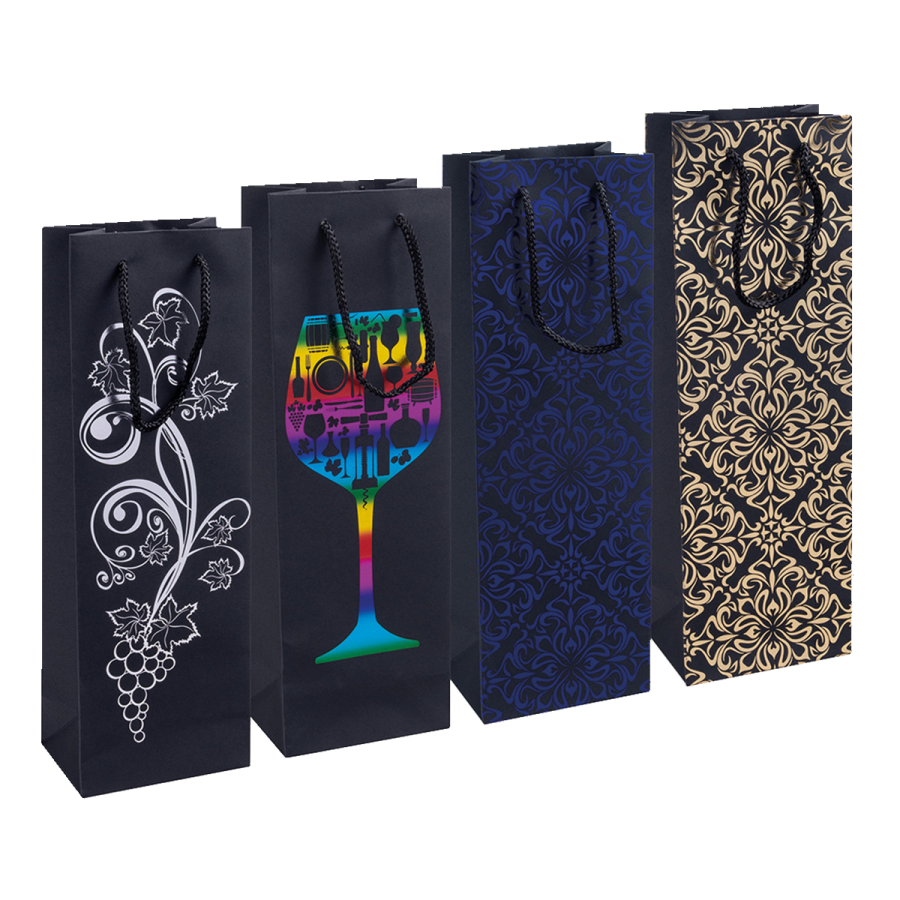 Sada kvalitních dárkových tašek určená pro balení 1 láhve vína či jiného nápoje. Laminovaný povrch je odolný proti oděru a poškození, atraktivní barvy a motivy. Zesílené dno, barevně sladěné pevné šňůrky pro pohodlné přenášení.