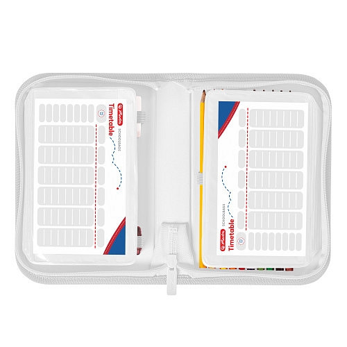 Penál 20,3x14x3,5cm, plný 2 chlopně, materiál polyester, 31 dílů (šestihranné pastelky, tužky, kuličkové pero, guma ořezávátko, pravítko, trojúhelník, fixy).