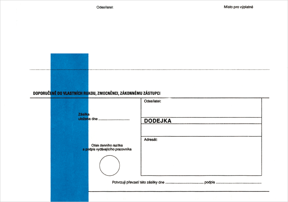 Obálky formátu C5 162x229mm s Dodejkou ve formě vytrhávacího okénka (okénko se v perforaci vytrhne z těla obálky), podlepeného samopropisujícím papírem, s modrým pruhem. 1 bal.=1000 ks