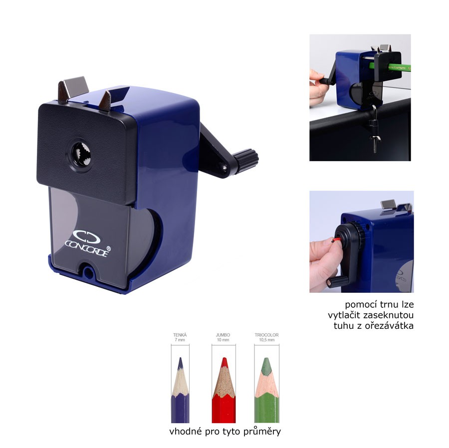 Pro běžné tenké i JUMBO tužky (pastelky). Automatické posouvání tužky při ořezávání. Mechanismus pro vytlačení zlomené tuhy z ořezávátka. Lze upevnit na pracovní desku.