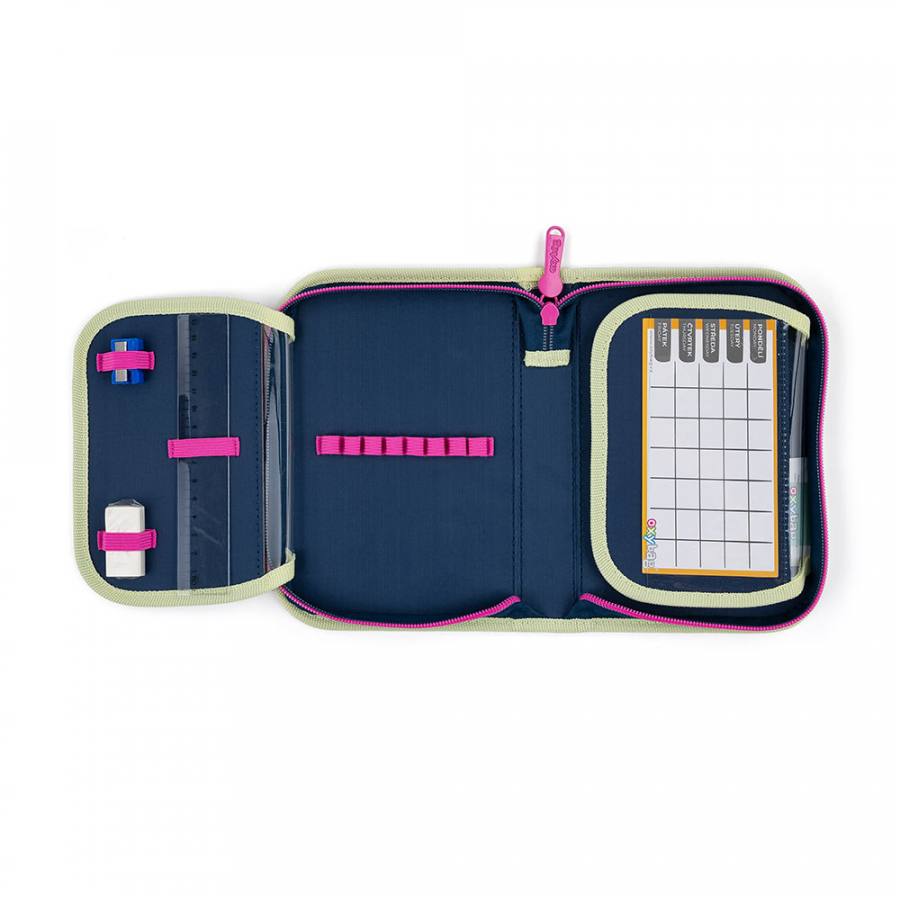 Jednopatrový školní penál se 2 chlopněmi, prázdný obsahuje 25 gumových poutek pro uchycení psacích potřeb. Na vnitřních chlopních jsou průhledné fólie pro rozvrh hodin. Rozměry: 13,5x20,5x4 cm.