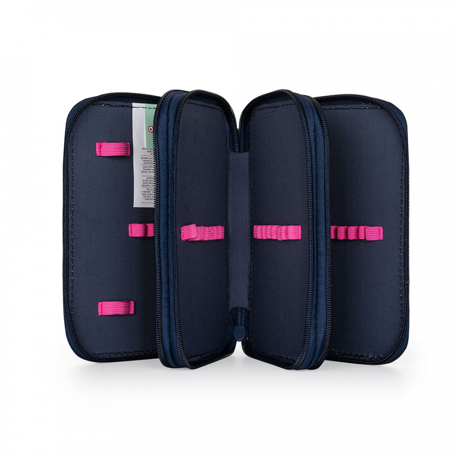 Školní penál třípatrový bez náplně. Penál obsahuje 40 gumových poutek pro uložení všech psacích potřeba a drobností potřebných k výuce. Penál má pevný zip s velkými taháčky pro snadnou manipulaci. Jedno patro je opatřeno průhlednou přihrádkou pro týdenní rozvrh. Rozměry 20x13x7 cm.